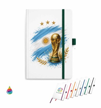 Tapa dura con cubierta de PVC y cartón de 1,5 mm. Cuenta con 80 páginas rayadas color blanco + 2 páginas en blanco, cinta marcapáginas, porta lapicera y cierre elástico a color. Certificación FSC en la primera hoja. Todos los cuadernos vienen en bolsa de polipropileno individual Ideal para kits de bienvenida, capacitaciones y eventos corporativos. Papel: 70 g/m²