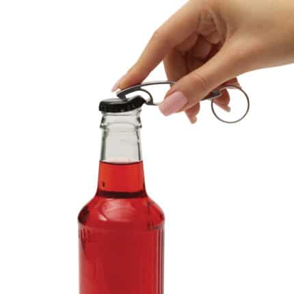 Llavero destapador compacto de aleación de zinc con detalles en PU y anillo de hierro, fabricado con materiales resistentes y duraderos. Cuenta con un diseño ergonómico y elegante en color negro, con anillo para llaves incorporado y destapador funcional, lo que lo convierte en un accesorio práctico para el uso diario. Es ideal para quienes buscan una herramienta útil y estilizada para abrir botellas en reuniones, viajes o eventos al aire libre.