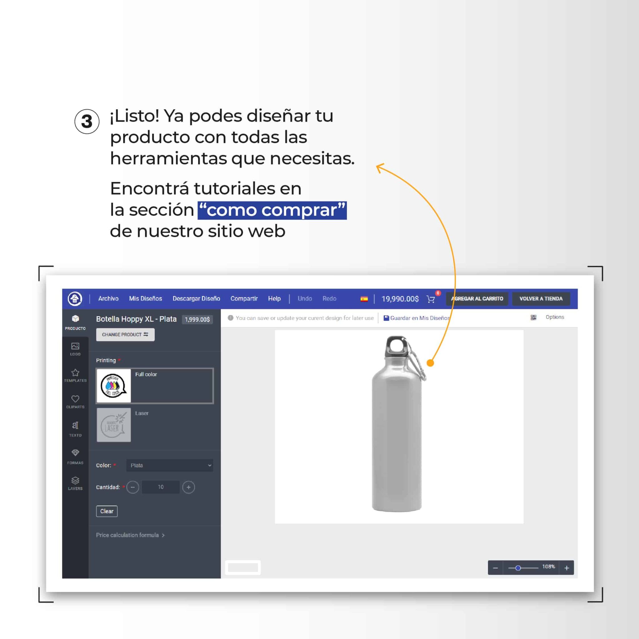 Botella de aluminio. Tapa de rosca plástica y gancho metálico.