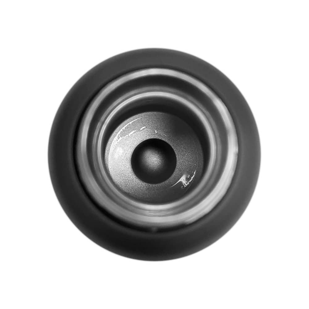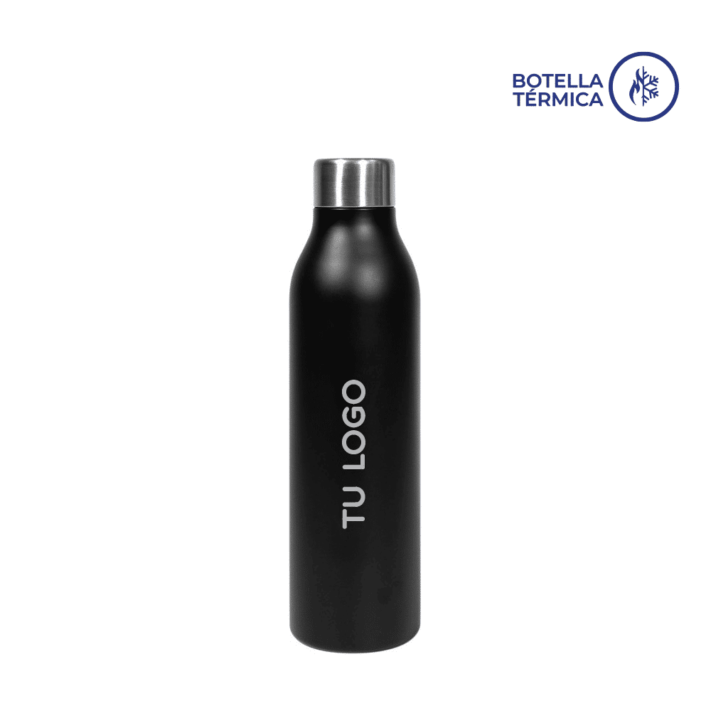 Botella doble pared, sellada al vacío con recubrimiento de cobre. Interior de acero 304 y exterior de acero 201. Pintura color negro mate. Tapa de acero a rosca.