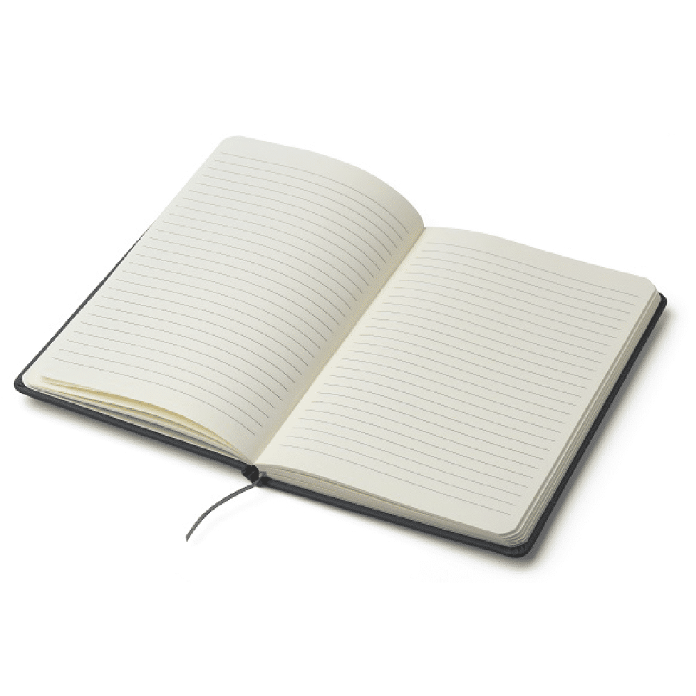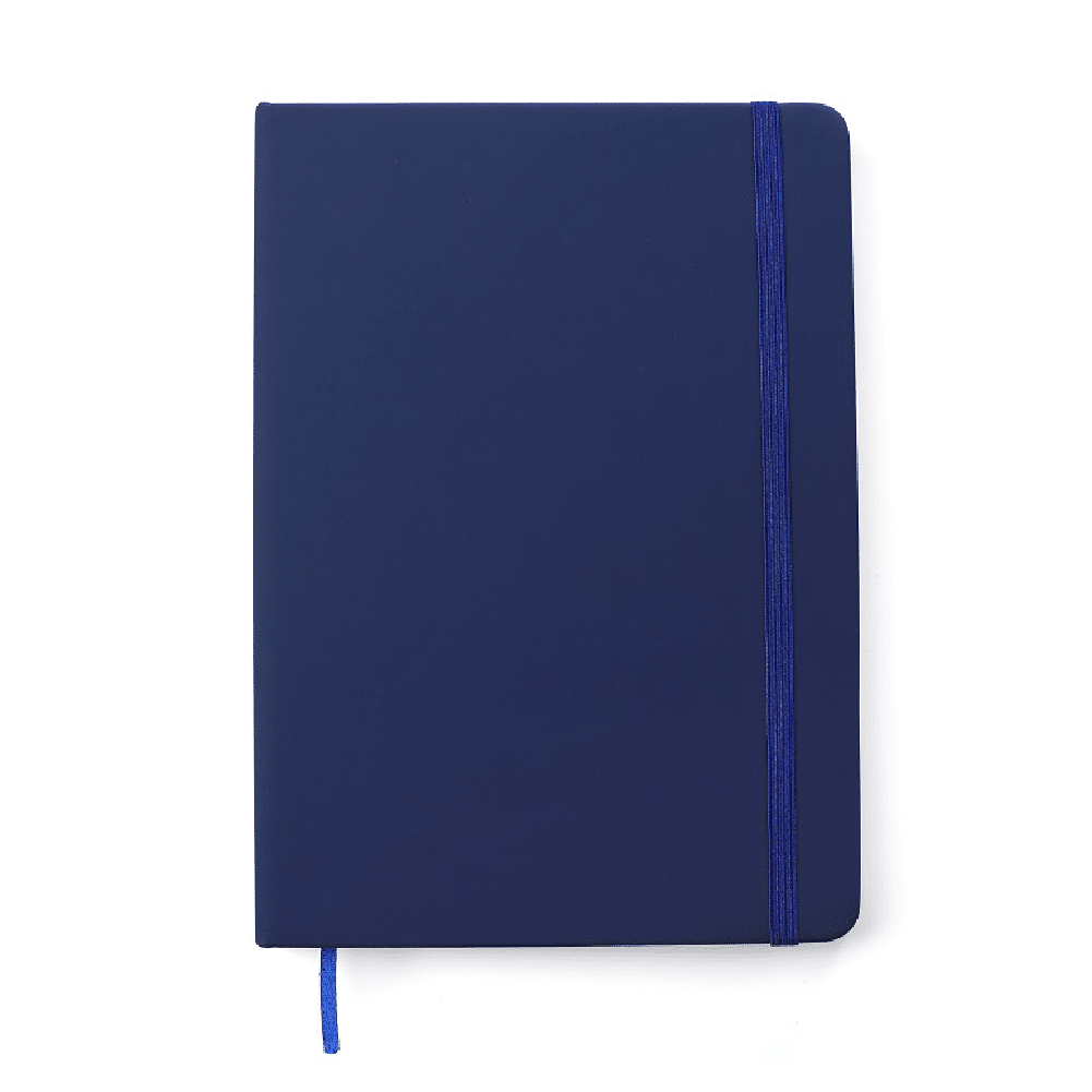 Cuaderno de 80 hojas lisas de 70 gr con tapa dura de cartón reciclado recubierto de PU. Cuenta con marcador de páginas color negro y, su tapa posee elástico porta lapicera. Encuadernación cosida.