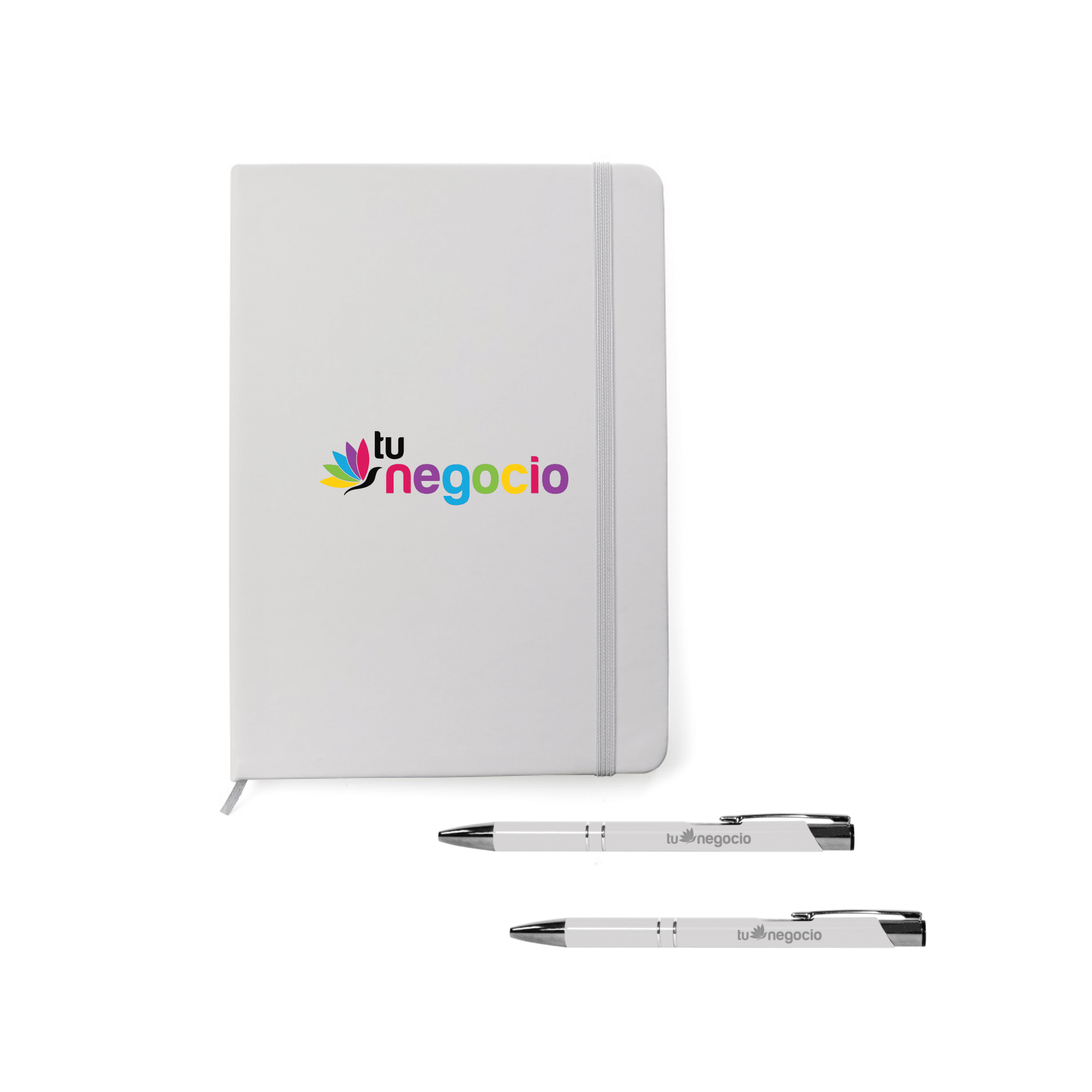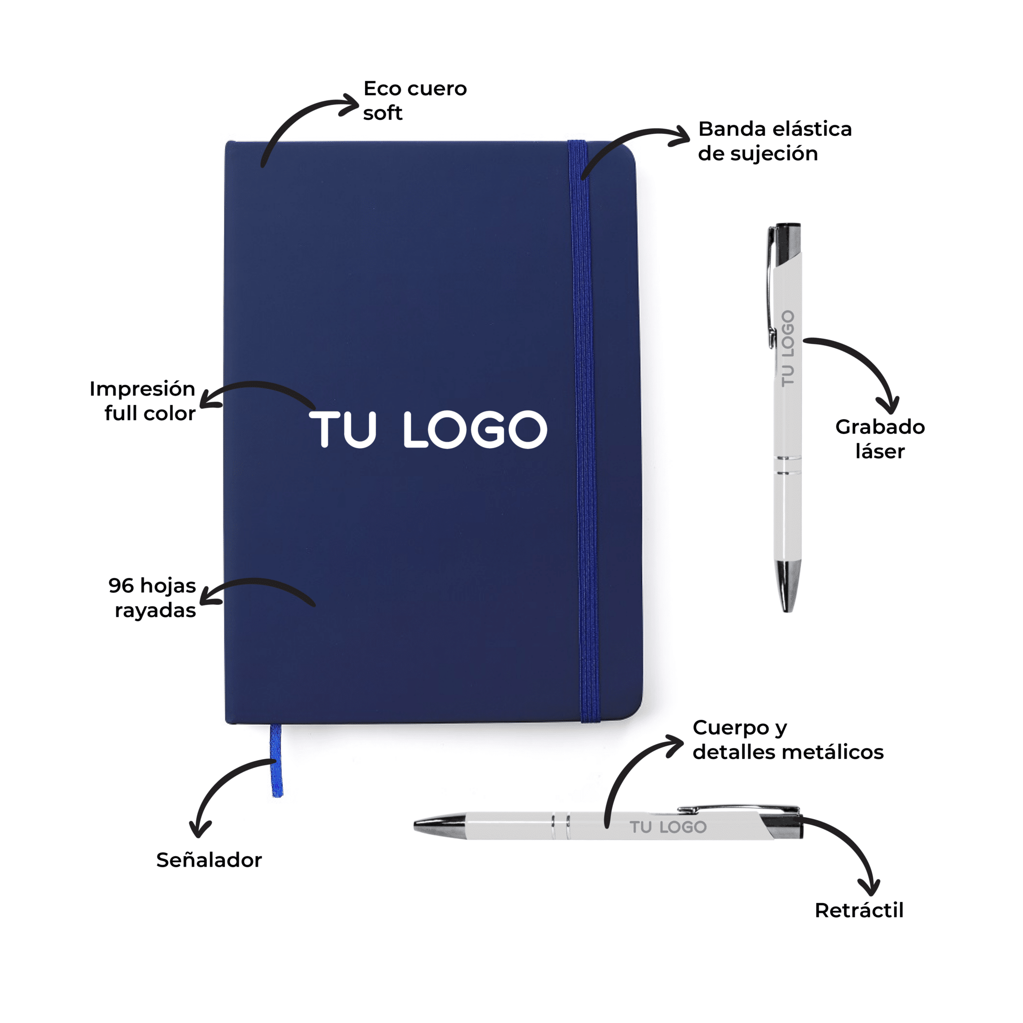 Set corporativo en caja laminada mate de papel. Cuenta con un cuaderno A5 de hojas rayadas, bolígrafo roller y una botella reutilizable de acero inoxidable con una capacidad de 350ml. Es ideal para regalos corporativos, kits de bienvenida, acciones promocionales o para uso ejecutivo diario.