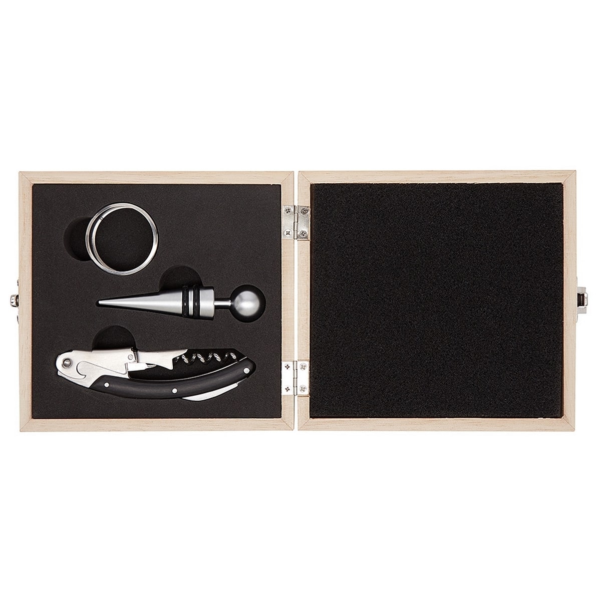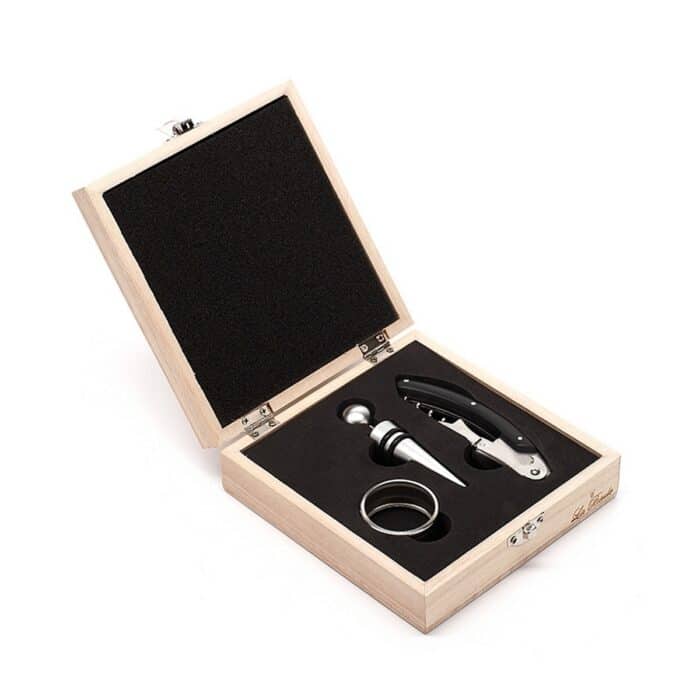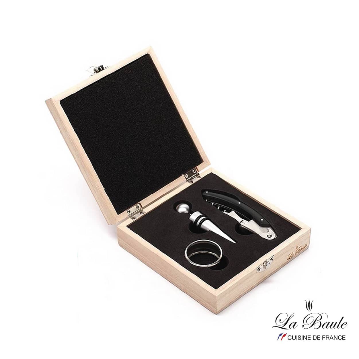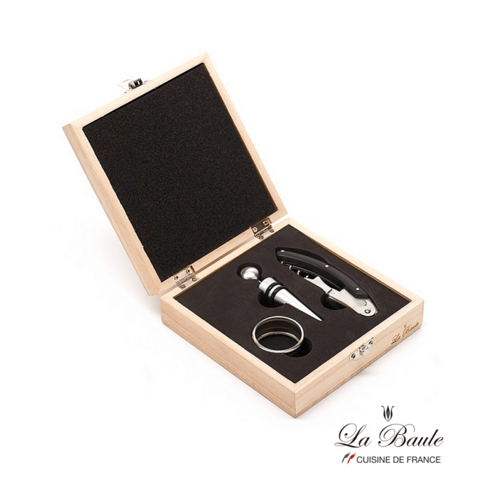 Posee: Sacacorchos dos tiempos, navaja y destapador corona, tapón y collar cortagota. Medidas de la caja: 15 x 14 x 4,7 cm. La Baule