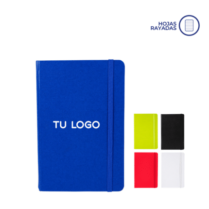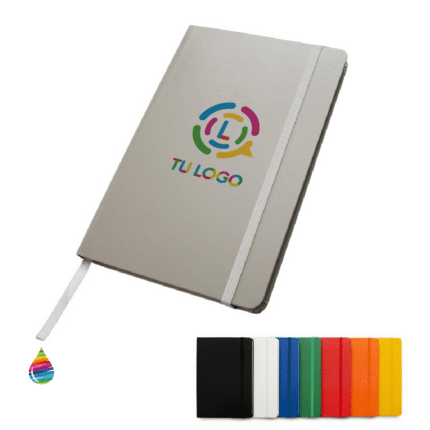 Cuaderno de 80 hojas lisas de 70 gr con tapa dura de cartón reciclado recubierto de PU. Cuenta con marcador de páginas color negro y, su tapa posee elástico porta lapicera. Encuadernación cosida.